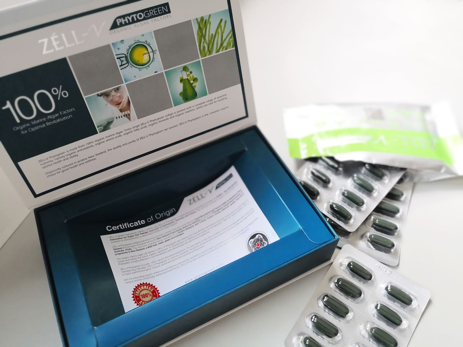 I personally had the privilege to try out Zell-V Phytogreen with 100% Organic Marine Algae Cell Factor for a month. These green tablets as shown in picture below were blue-green marine algae extracts of potent nutrients namely antioxidant and C-Phycocyanin, organically cultivated in New Zealand. There was even a certificate of origin in the box containing the 30 tablets.
